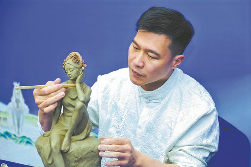 Li Jinfeng sculpts a clay figurine at the ceremony. [Photo provided to China Daily]