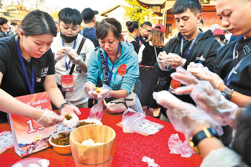 Visitors from Taiwan experience the making of baiguo, a Shaxian snack made from rice, during a culinary cultural event in Shaxian, Fujian province, in December. ZHANG BIN/CHINA NEWS SERVICE