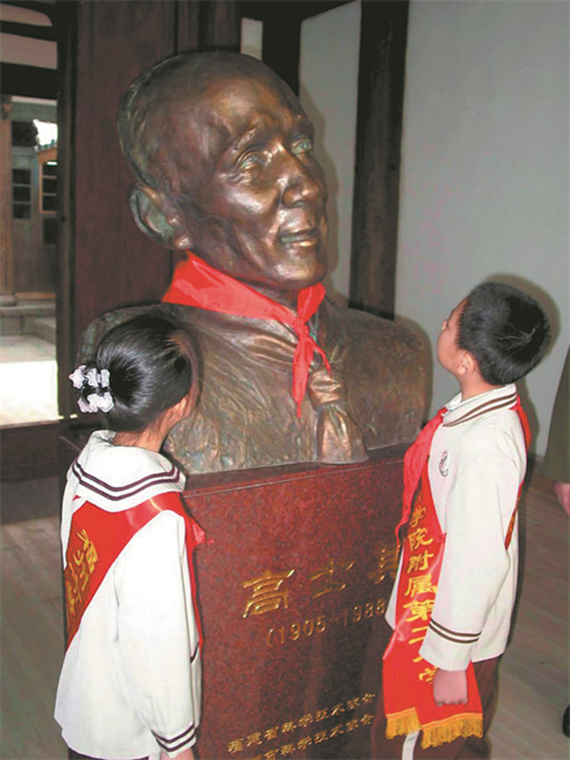 Students admire a bronze statue of Gao Shiqi at his former residence in Fuzhou, Fujian province. XU XUEYI/XINHUA