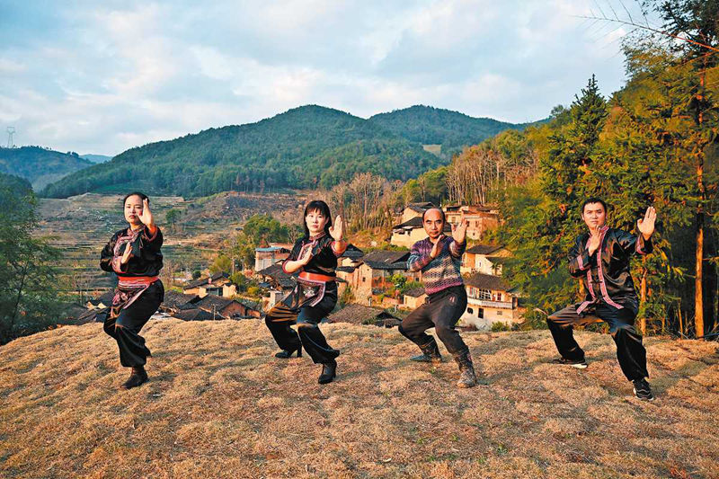 Zhong Tuanyu (second from left) leads three fellow villagers to practice She ethnic martial arts at Jindouyang village in Fu'an, Fujian province, in March. JIANG KEHONG/XINHUA