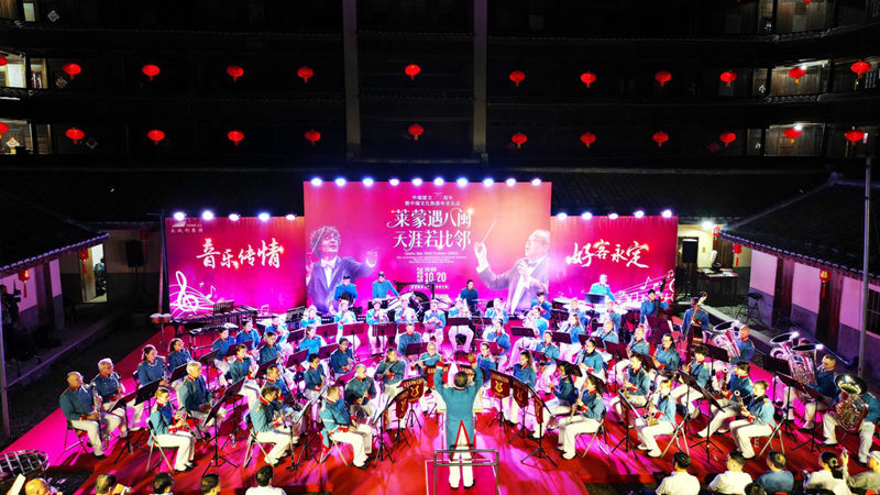 Tulou in Daxi village, Yongding district, Longyan, Fujian province, was illuminated as more than 70 members of the Geneva State Wind Orchestra from Switzerland delivered a transcendent symphonic performance.