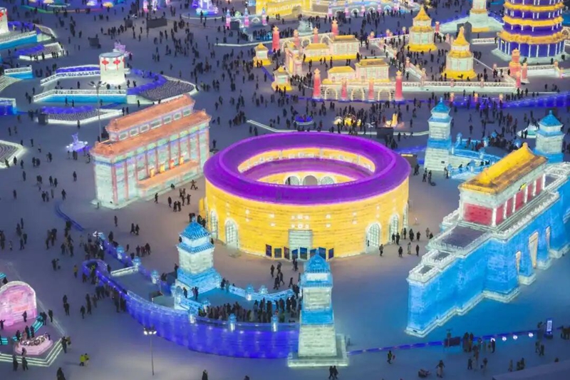 A Fujian tulou-inspired ice sculpture is featured at Harbin Ice and Snow World. [Photo provided to chinadaily.com.cn]
