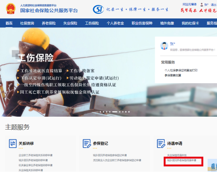 进入国家社会保险公共服务平台——选择“养老保险”——选择待遇申请“城乡居民养老保险待遇申请”——选择参保地——填写参保登记信息、待遇发放信息——上传相关材料——提交申请。