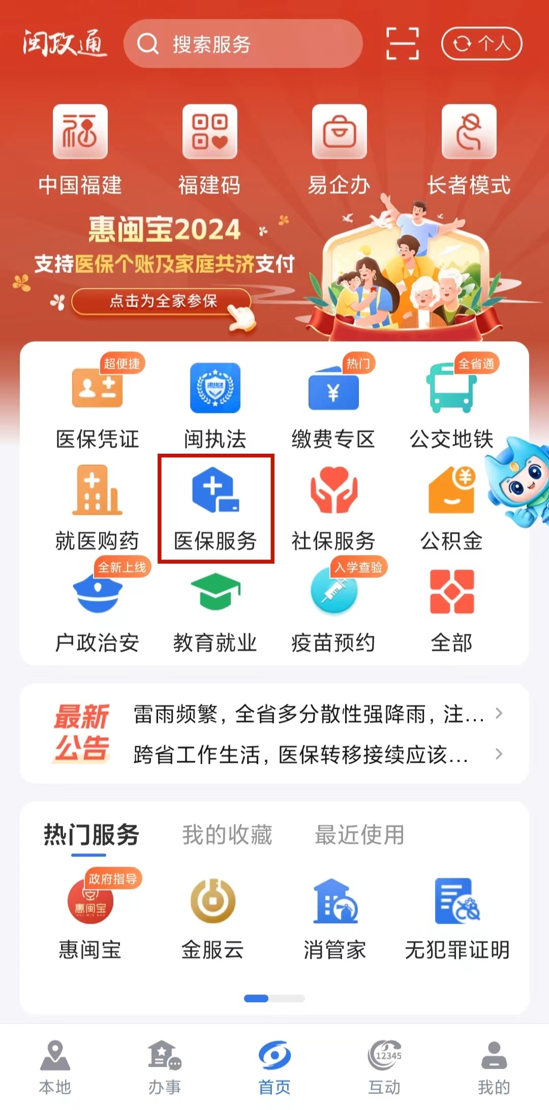 第一步,打开闽政通APP,点击【医保服务】。