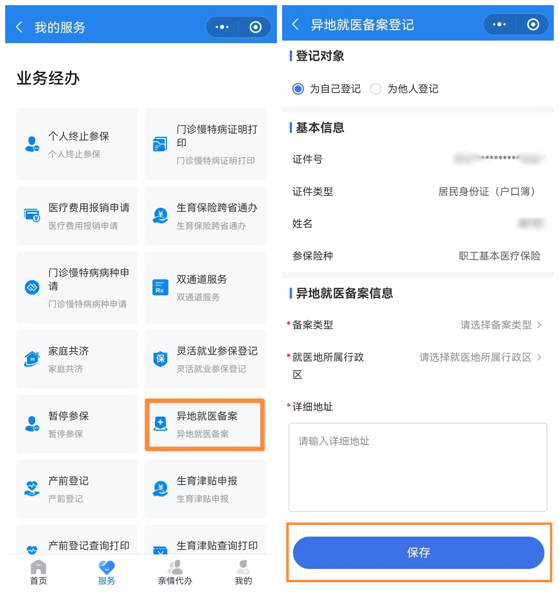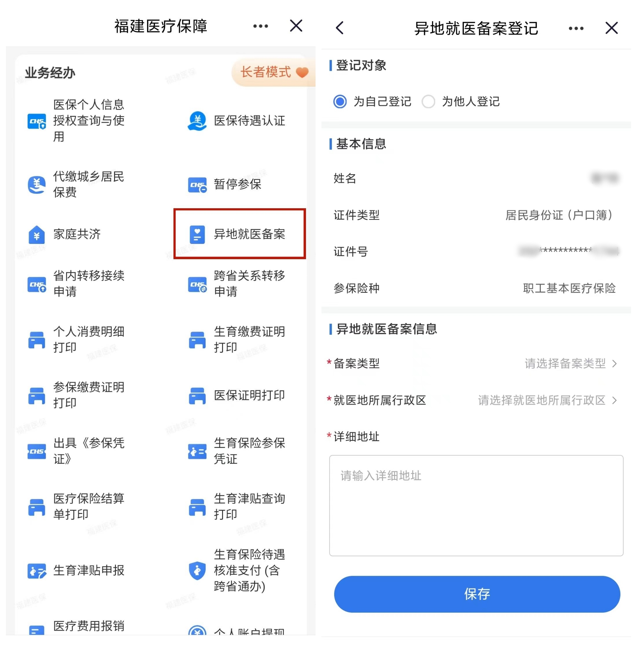 第二步,点击【异地就医备案】,根据提示填写相关信息,点击【保存】,完成备案。