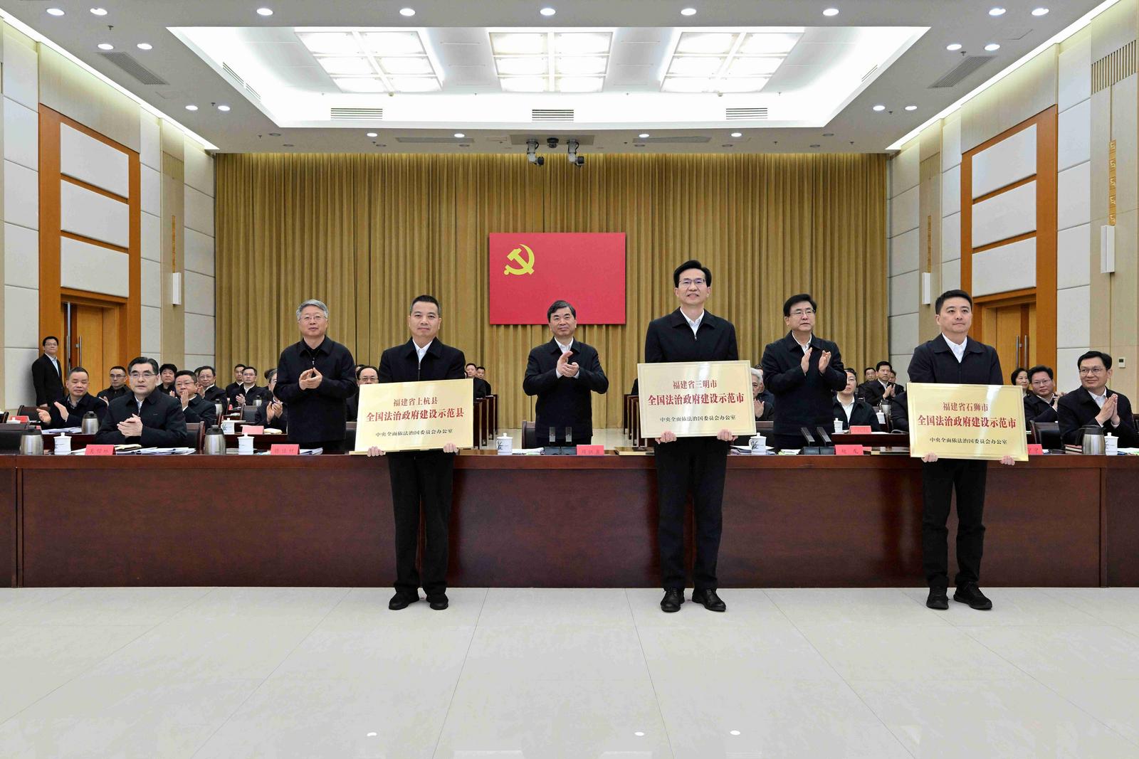 会议通报了我省法治督察情况,为我省获得第三批全国法治政府建设示范地区和项目命名的单位授牌。省纪委监委、省司法厅、省生态环境厅和福州市政府、三明市委、晋江市委、上杭县委的负责同志作了交流发言。