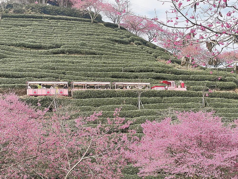 在台品樱花茶园,游客乘坐樱花观光小火车赏美景、迎新年。