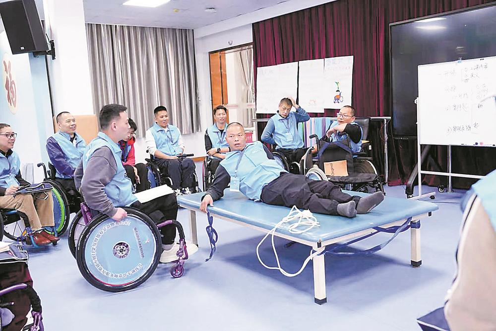 2025年福建省脊髓损伤者自助互助康复服务师资骨干训练营上,伤友在训练康复动作。