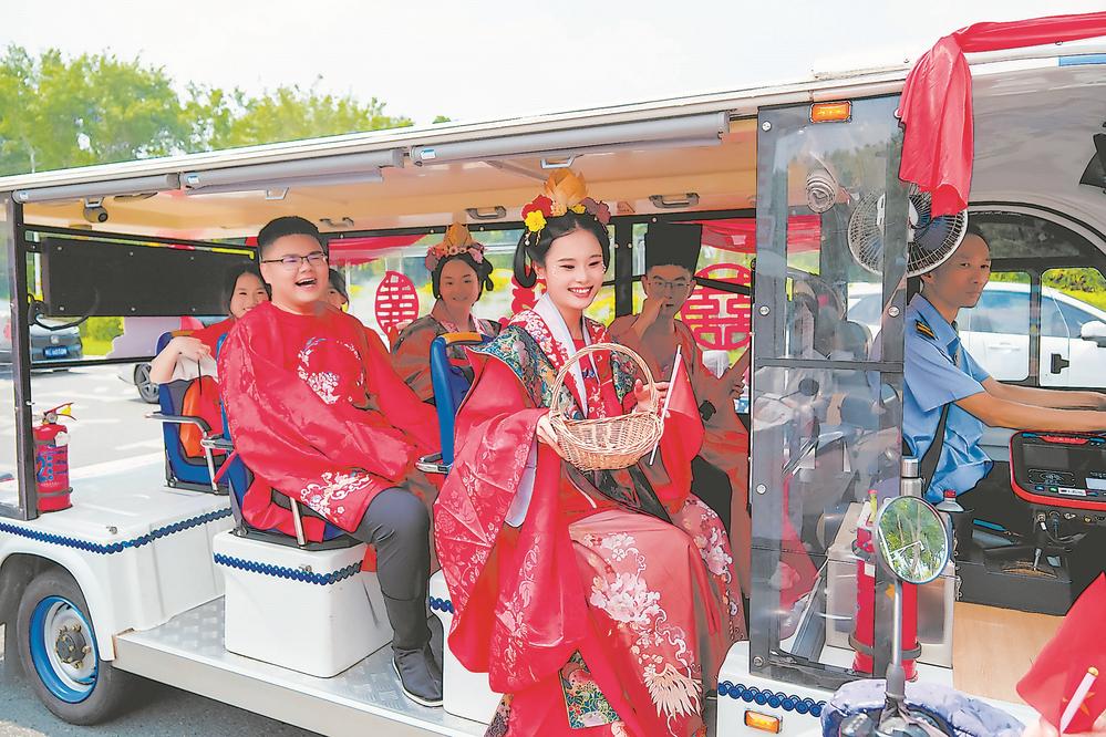 10月1日,“家国同心刺桐情·宋元礼韵结良缘”集体婚礼暨“邻鲤相牵·幸福联线”婚恋文化月启动仪式在泉州古城举行。15对新人身着传统婚服,乘“小白”婚车沿芳草园、泉山门等古城地标巡游,传递幸福与文明新风。(记者 何金 通讯员 潘煌杰 摄)