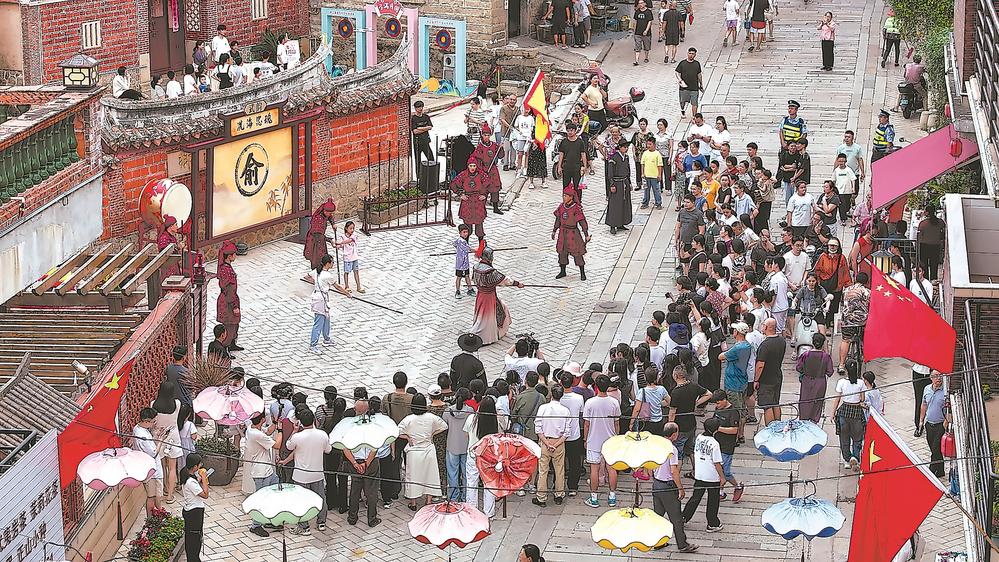 10月1日,宋时风华·烟火洛江——“四名”文化沉浸式互动演绎活动在泉州市洛江区桥南古街举行,游客在街头体验俞家棍。(记者 汤海波 通讯员 庄伊欣 摄)