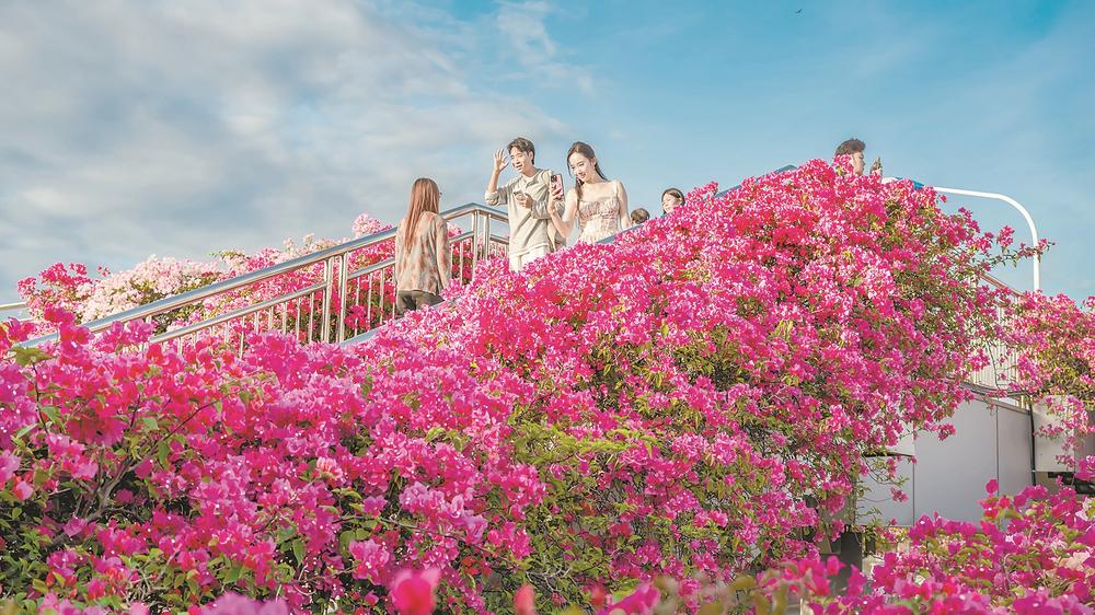 近日,厦门“市花”三角梅迎来盛放期,紫色、玫红、大红、橙黄等各色三角梅装点着各大公园和城市街头的高架桥、人行天桥。图为集美杏滨路高浦人行天桥三角梅灿烂绽放,花开如瀑。(通讯员 陈瑞坤 摄影报道)