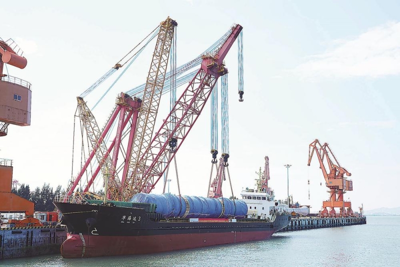 23日,全球产能最大的高端双峰HDPE(高密度聚乙烯)干燥机顺利运抵漳州古雷港。该设备长约42米,直径4.7米,重量超500吨,采用特殊设计,年产能达40万吨,可连续运行超8000小时,是中沙古雷乙烯项目HDPE装置的核心设备,在产业高端化、智能化、绿色化发展等方面将发挥重要作用。(杜正蓝 柯少如 摄影报道)