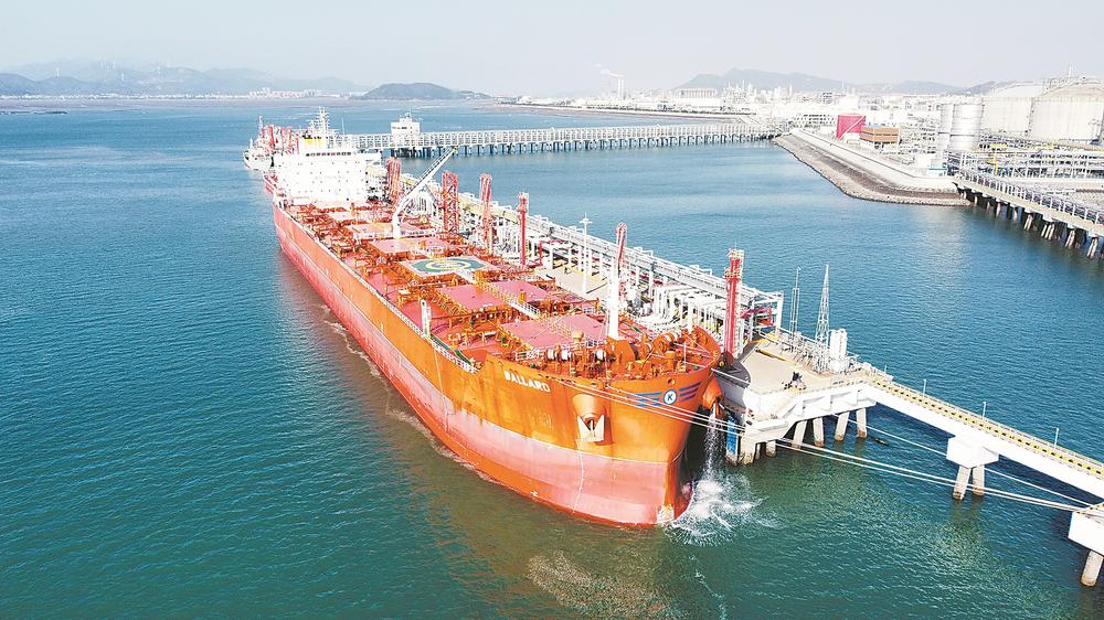 CABU是一种液货、散货两用型船,主要用于运输烧碱溶液与干散货,其混合装载模式,可以有效降低船舶运营中的空载率。“芭乐”轮总长228.4米、型宽32.3米,载重达64995吨,是目前全球最大的CABU船型之一,本航次计划在榕装载42000吨液碱前往澳大利亚。(记者 张颖 通讯员 李杉杉 摄)