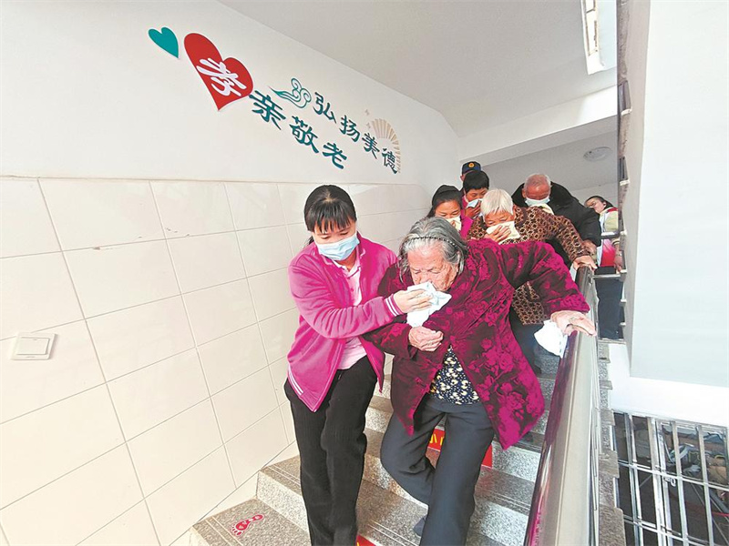 1月14日,在泉州市泉港区(山腰)中心敬老院,消防员联合志愿者开展消防安全宣传教育暨培训演练活动,把“安全课”送到老人身边。图为在护理员的搀扶和引导下,老人沿着预定路线有序撤离至室外安全区域。(记者 庄钊滢 通讯员 吴文霞 摄影报道)