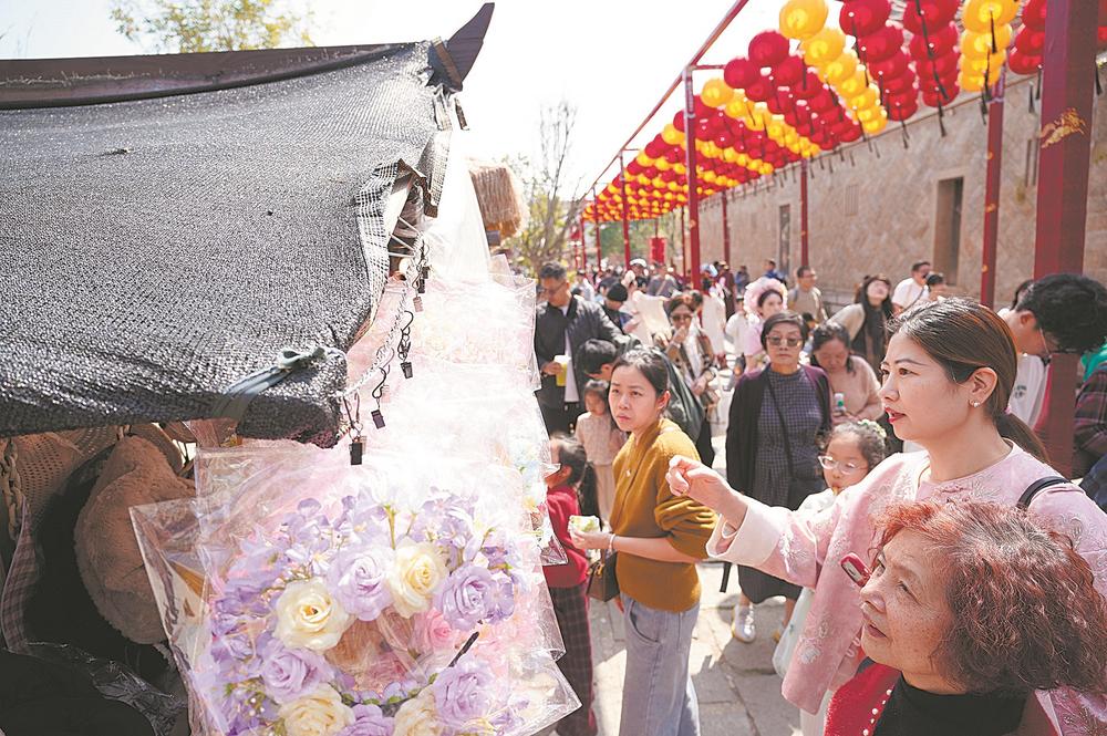 2月20日,在晋江梧林古村落,游客正在挑选簪花头饰。记者 王毅 摄