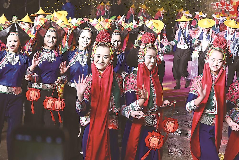 1日晚,2026年“马上繁花 惠女游灯”元宵游园活动于惠安县小岞镇举行。迎着春雨,近千名惠安女身着传统服饰,手提璀璨花灯,共庆元宵佳节。(记者 庄钊滢 摄影报道)