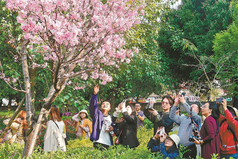 眼下,春暖花开、万物复苏,正是踏青赏景好时节,人们走出家门,乐享春日时光。图为24日,游客在泉州开元寺踏青赏花、拍照。(通讯员 林升 摄)