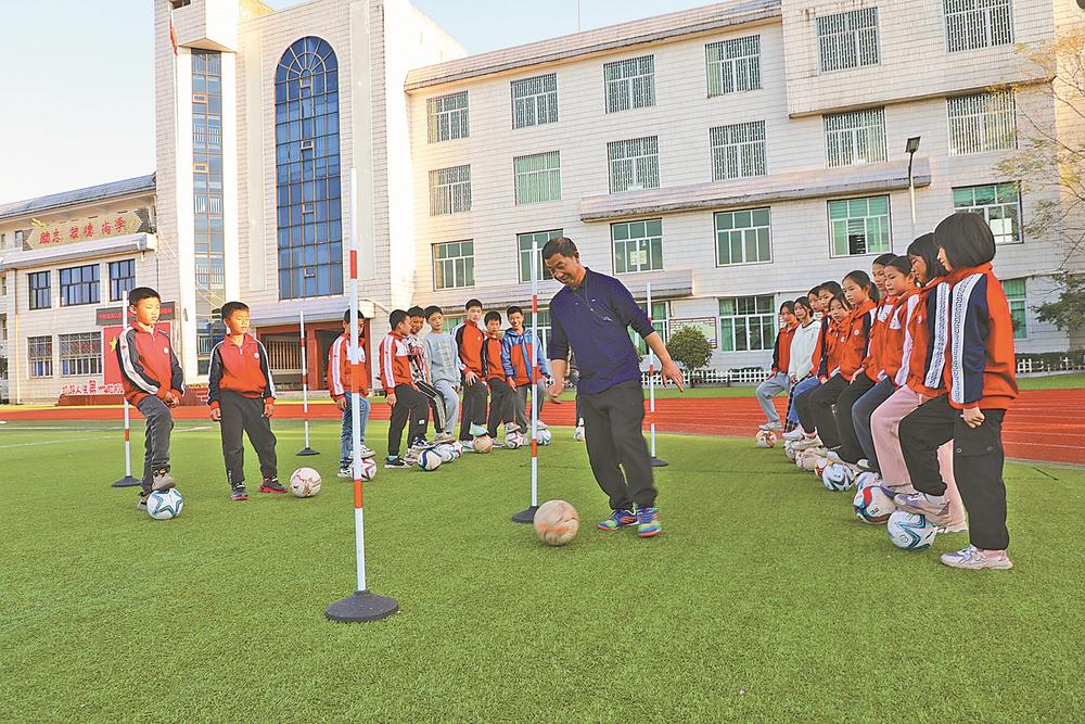 2018年,学校筹资180多万元,将昔日的荒草地建成标准化足球场,并配齐足球、标志桶、训练背心、敏捷梯、体能训练器械等装备,点燃孩子们的足球梦。与此同时,学校积极开展“校园足球文化”系列活动,通过“玩足球、画足球、讲足球、赛足球”等形式,不断丰富校园足球文化,让学生爱上足球。