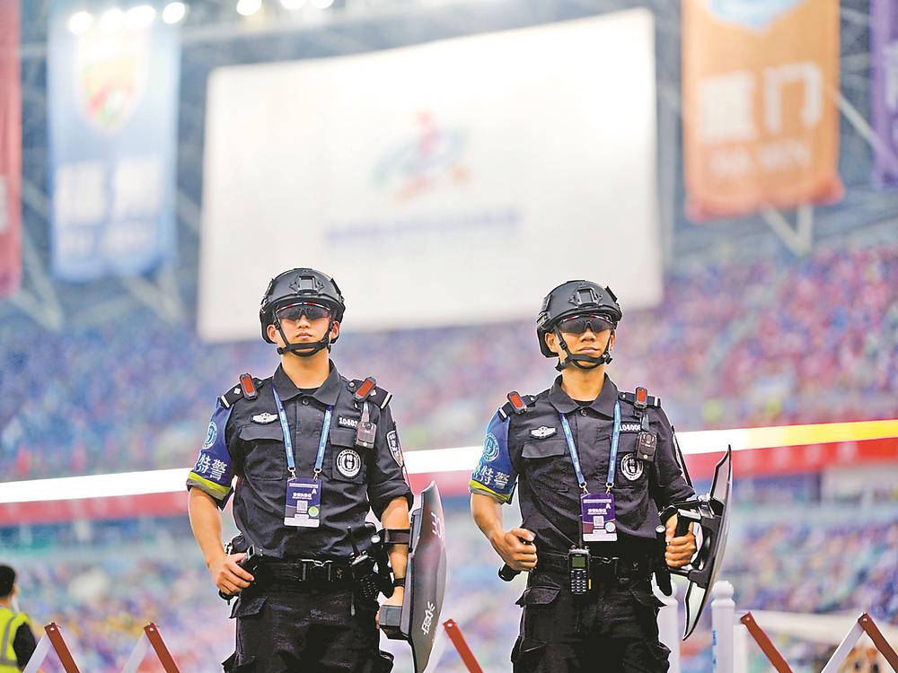 福州市公安局巡特警支队民警在“闽超”揭幕战现场执勤。(郑宇涵 摄)