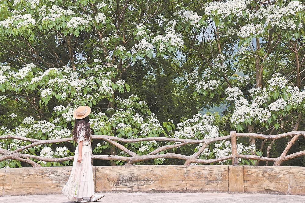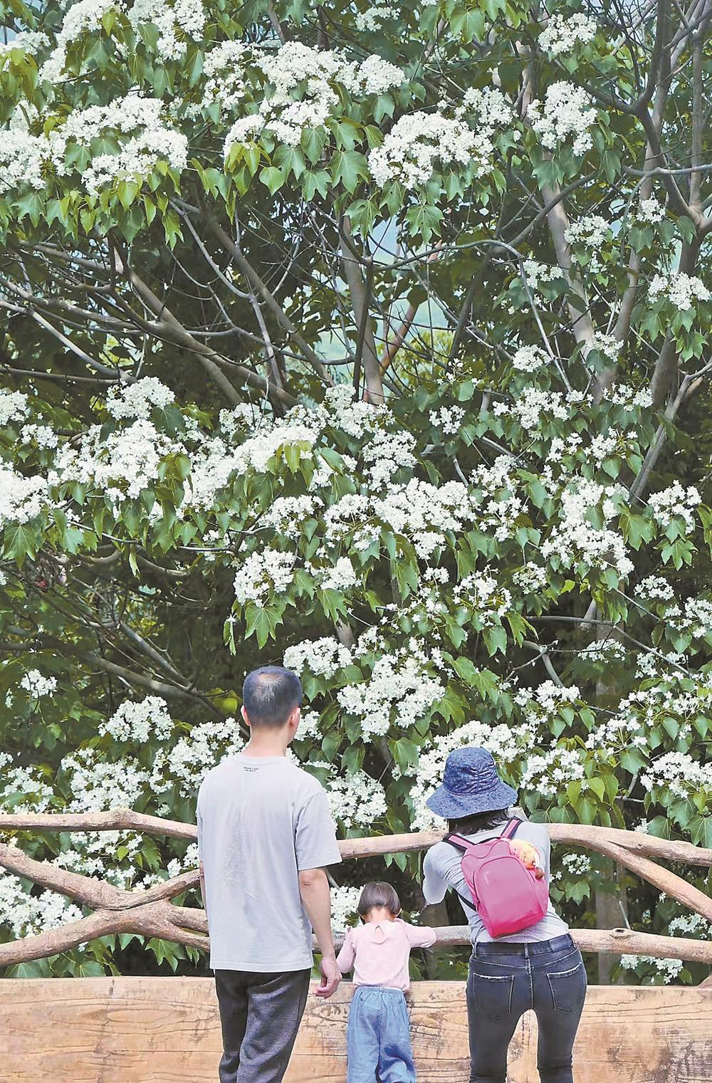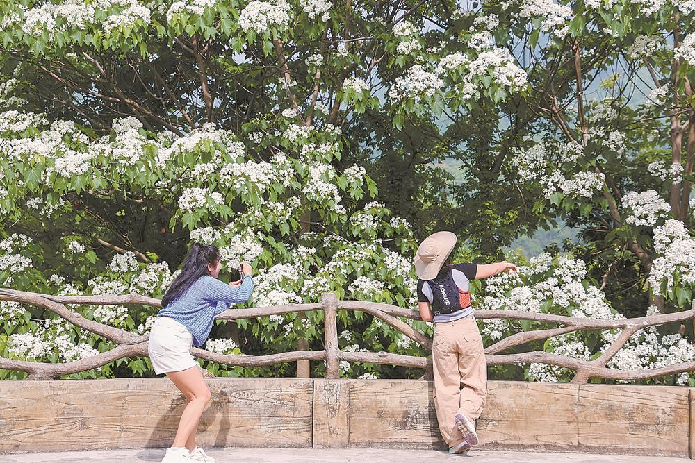 近日,厦门市海沧区天竺山4万株桐花迎来盛花期,漫山桐花如云似雪,洁白的花朵缀满枝头,与翠绿山林相映成趣,吸引众多市民游客前来踏青赏景。图为20日,游客在天竺山观赏盛放的桐花。(通讯员 李娴凤 摄影报道)