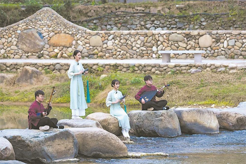 安溪县金谷镇金谷村因“艺术点亮乡村”的蝶变而声名鹊起。图为一场别开生面的音乐会在金谷村潺潺流淌的溪流中上演,点燃在场游客的热情。(资料图片)