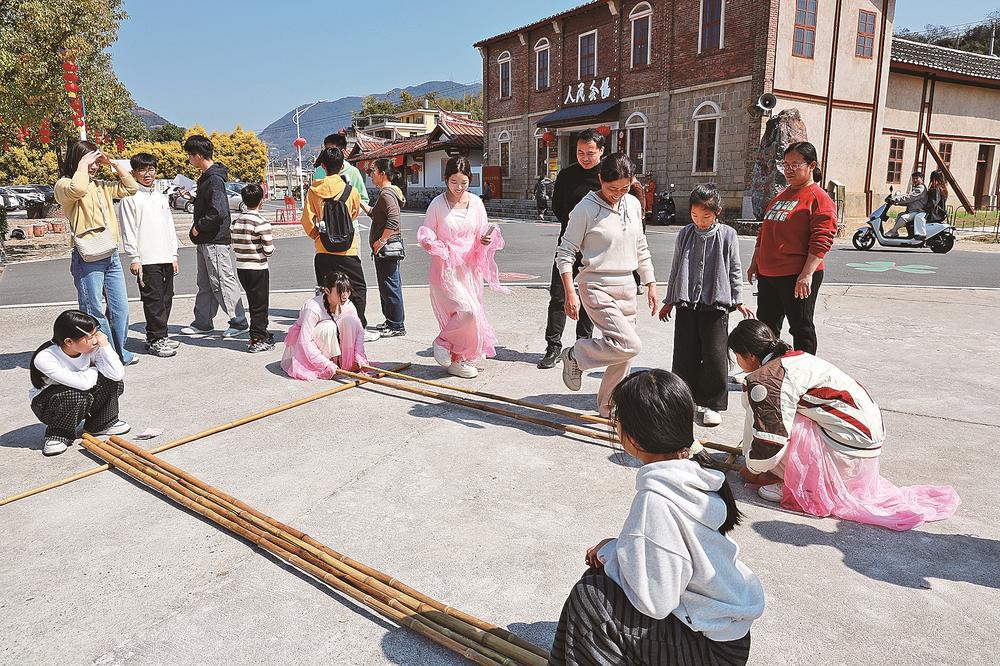 “剧本游只是一种形式,互动强、有趣味才是关键。”剧本游现场执行导演张金梅表示,为让游客获得更强的体验感,剧本游不仅设计了多样化的互动游戏,确保老中青幼各类人群都能参与其中,还着重植入本地非遗元素,让游客在“剧中游”的同时,能够品尝非遗米香、学习竹竿舞和抛陀螺等。此外,活动还开展甲胄巡游、国风走秀等环节,让游客能够看演艺、玩剧本、做文创,全方位沉浸在土楼文化与国潮体验之中。