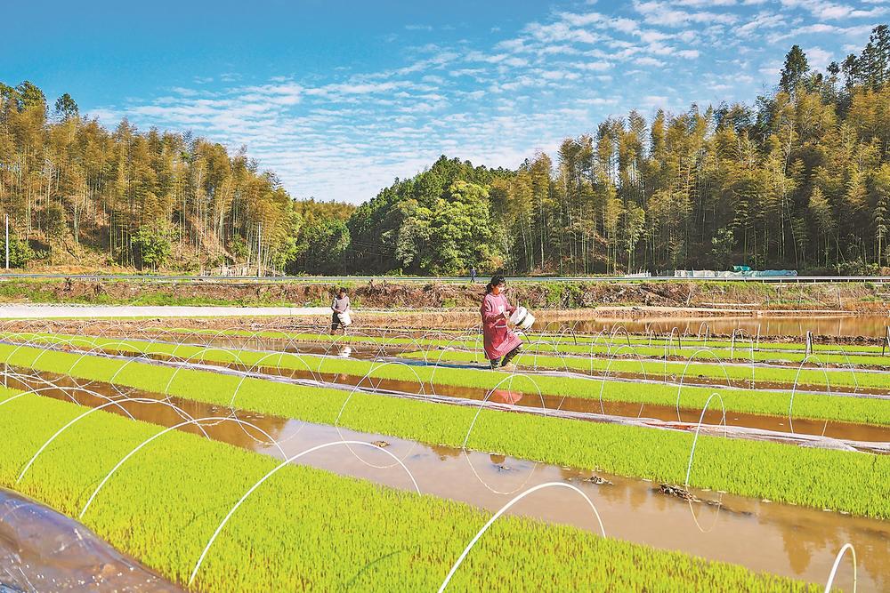 4月1日,在建宁县溪口镇枫元村高标准制种基地,农户趁着晴好天气为早制母本秧苗施肥。近年来,当地推广育秧盘育秧,育秧效率大幅提升,传统一亩秧地仅能供应12至15亩大田,育秧盘育秧可供应80亩大田且秧苗规整健壮,适配机械化插秧。陈震 庄紫怡 摄