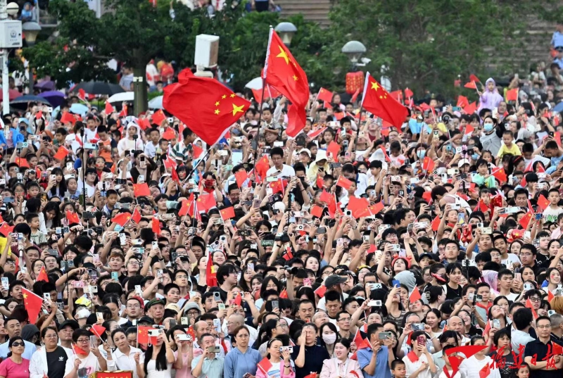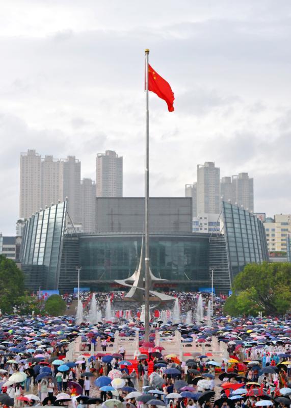 8点整,军乐团奏响雄壮的《义勇军进行曲》,升旗手振臂一挥,鲜艳的五星红旗冉冉升起。全体肃立、齐声高唱国歌,目送五星红旗升至旗杆顶端。全场响起掌声和欢呼声,大家挥舞着手中的国旗,由衷表达对祖国的热爱。