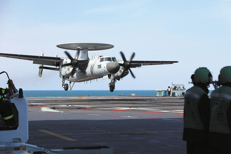 A KJ-600 early-warning and control plane lands on the aircraft carrier. PHOTO BY LI TANG / FOR CHINA DAILY