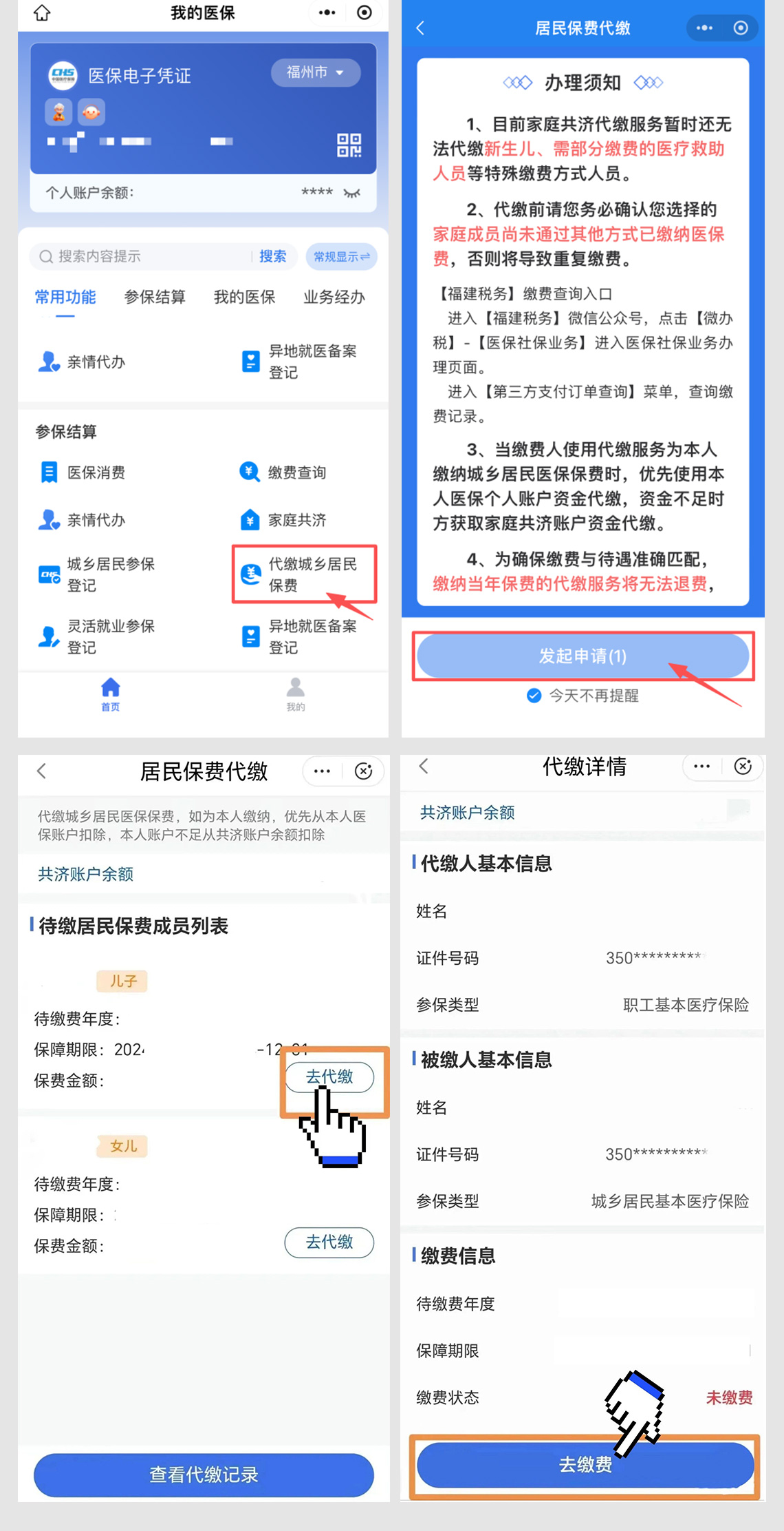 以“福建医疗保障”微信小程序为例,完成家庭共济成员邀请后,在参保结算栏目点击【代缴城乡居民保费】,仔细阅读《办理须知》后,点击【发起申请】。