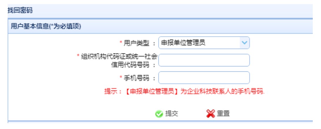 1.通过单位当时注册时填写的组织机构代码证或统一社会信用代码号码及科技联系人手机号找回。点击登录页面密码输入框后面的“找回密码”超链接进入页面,按页面提示操作,若操作成功单位科技联系人的手机号码将收到单位的登录账号和临时密码,如下图所示: