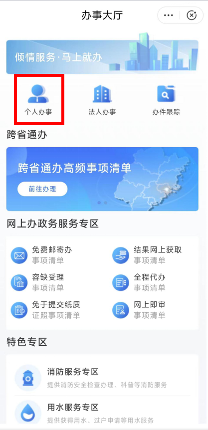 1.登录福建省网上办事大厅首页,点击“我要办”,在下拉框中选择“个人办事”。