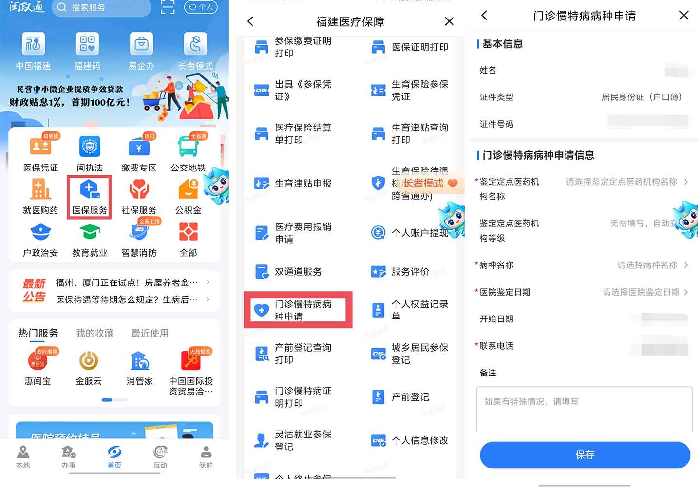 参保人员登录闽政通APP,点击【医保服务】,点击【门诊慢特病病种申请】,填写相关信息点击【保存】提交申请。