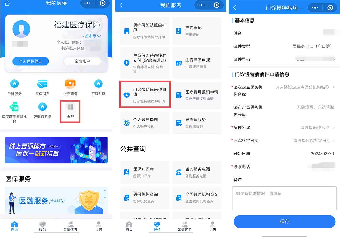 参保人员进入“福建医疗保障”微信小程序,点击【全部】,点击【门诊慢特病病种申请】,根据提示填写相关信息,点击【保存】,完成备案。