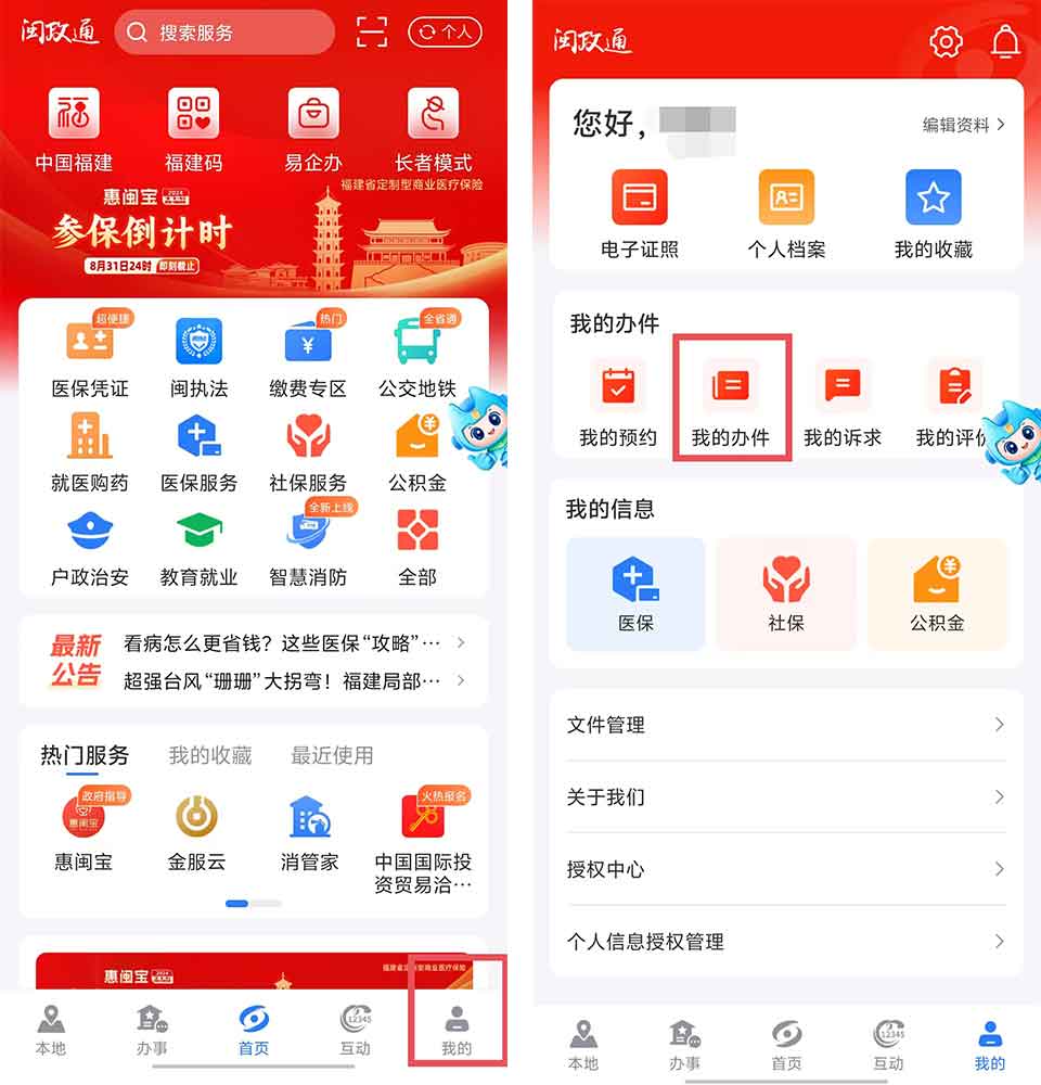 参保人员登录闽政通APP,点击【我的】,点击【我的办件】即可查看办理进度。