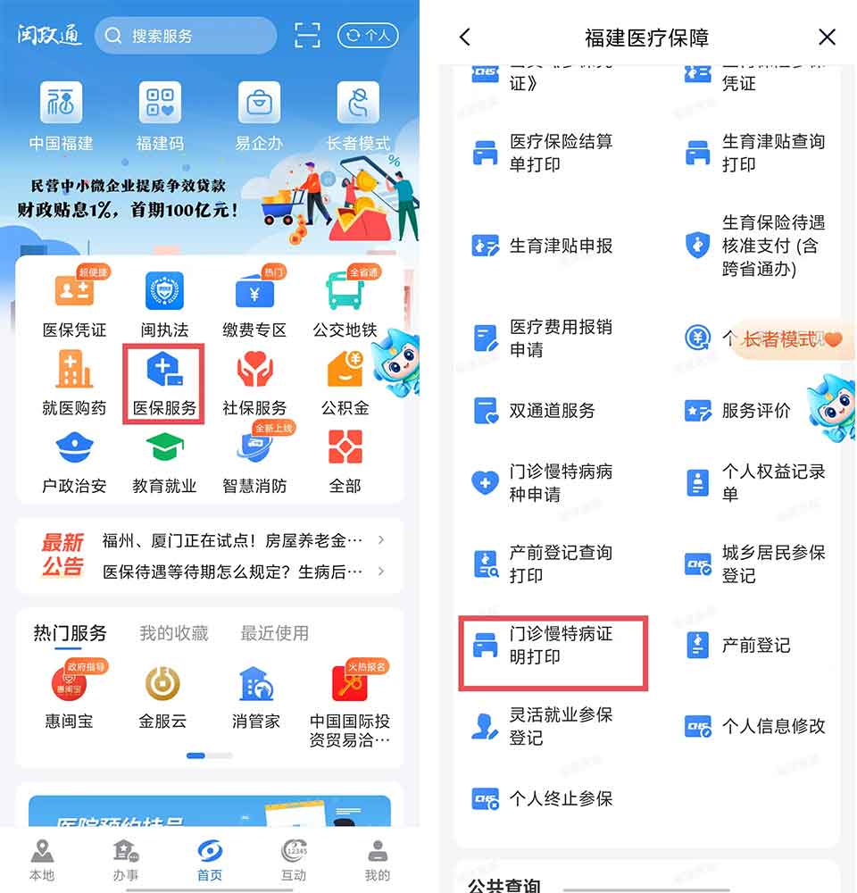 参保人员登录闽政通APP,点击【医保服务】,点击【门诊慢特病证明打印】,即可打印门诊慢特病证明。