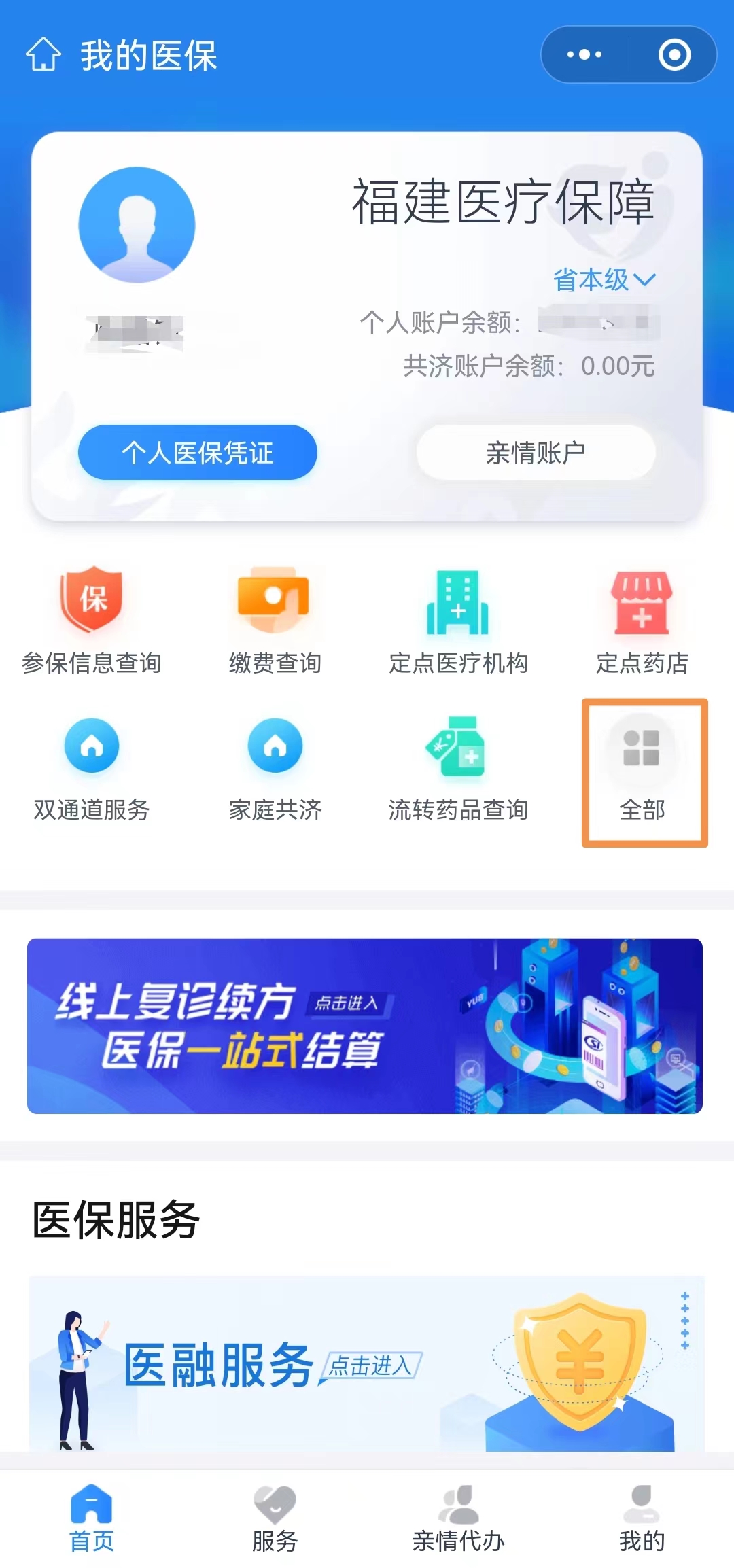 第一步,打开“福建医疗保障”微信小程序,点击【全部】。