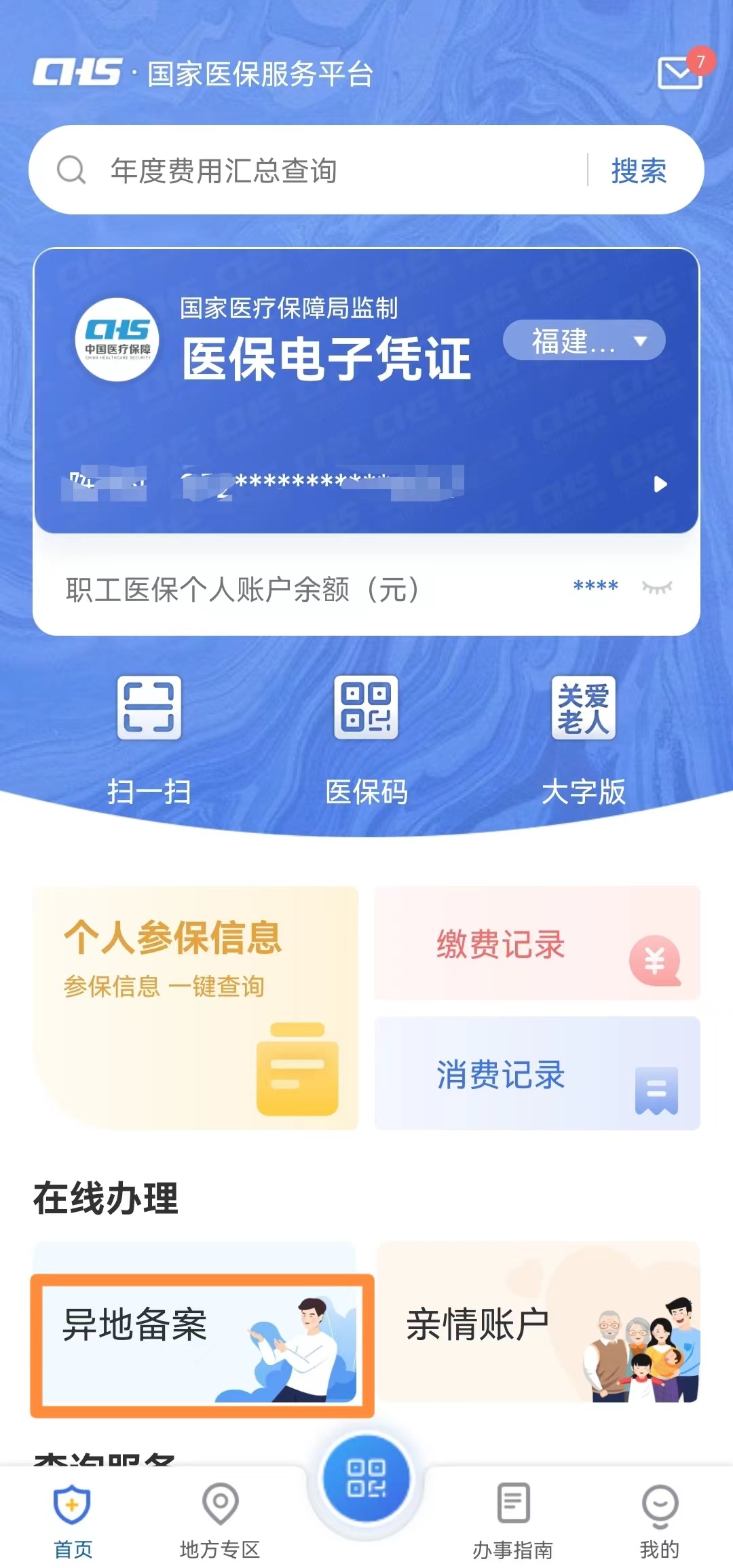 第一步,进入国家医保服务平台APP首页,点击【异地备案】。