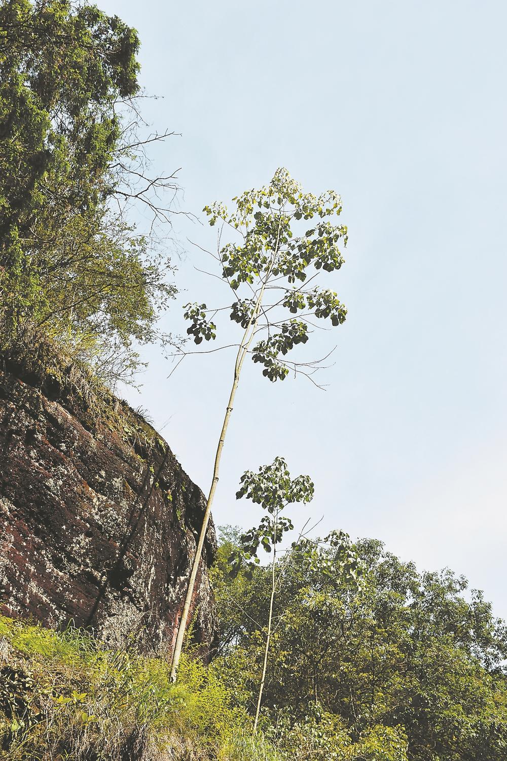 近日,在永安市桃源洞风景区的峭壁上,当地林业工作人员发现国家二级保护野生植物丹霞梧桐群落。这是该物种在福建的首次记录。