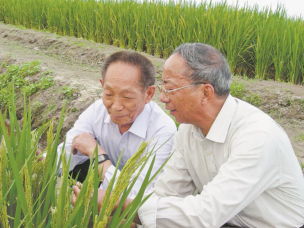 谢华安(右)与袁隆平在海南南繁基地(资料图片)。省农科院供图