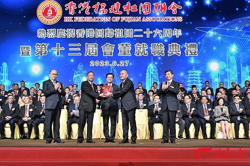代表团一行看望了在港闽籍乡亲,与香港政界、科技界、商界的闽籍乡亲代表和青年骨干座谈交流,并出席庆祝香港回归祖国26周年暨香港福建社团联会第十三届会董就职典礼。(记者 严顺龙/文 肖春道/图)