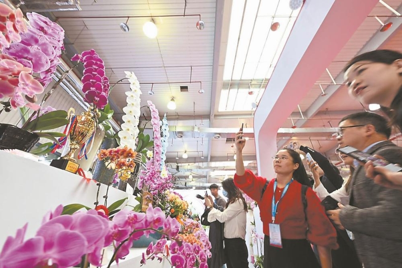 在花博会漳州展区,获奖蝴蝶兰吸引参观者纷纷拍照。记者 王毅 摄
