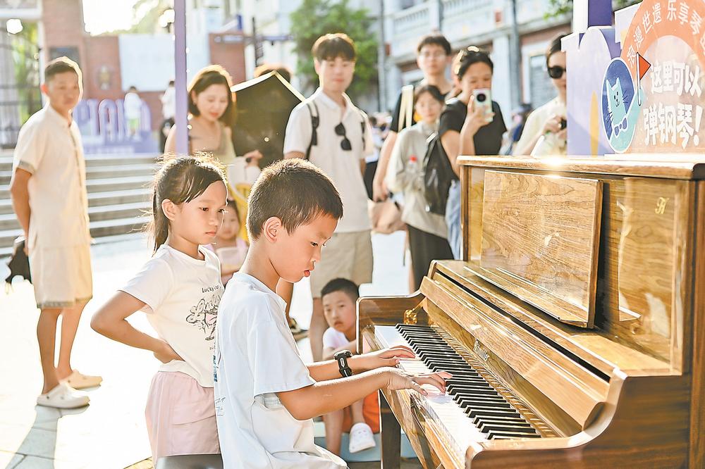 厦门鼓浪屿的“流动乐章”钢琴艺术演奏点,儿童在即兴表演。(资料图片)