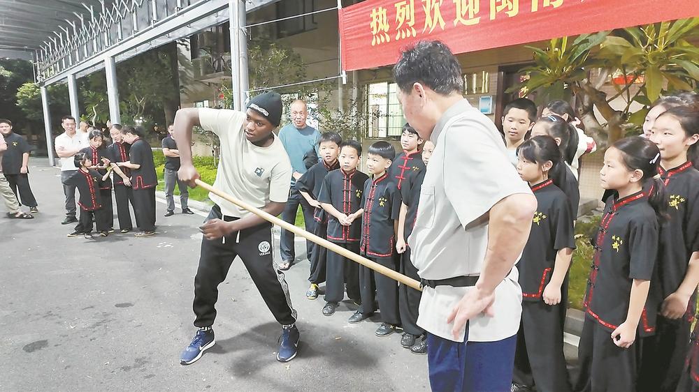 “看到武术队的孩子们练武时神气活现的样子,自己很受感染,也对这里的文化和风俗有了很直观的体验。”来自喀麦隆的学生艾瑞克跃跃欲试,拿着棍子挥舞起来。