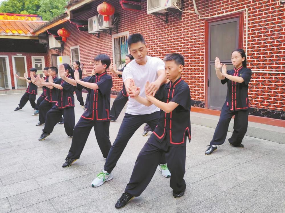 载誉归来,生活很快回归日常。在圳头社区祠堂青砖铺就的场地上,教练陈伟平手握竹尺,轻敲一个孩子的膝盖:“腰再沉一寸!”他师承龙文区武术协会荣誉会长陈金水。竹尺下,是龙文武术一代又一代的言传身教。