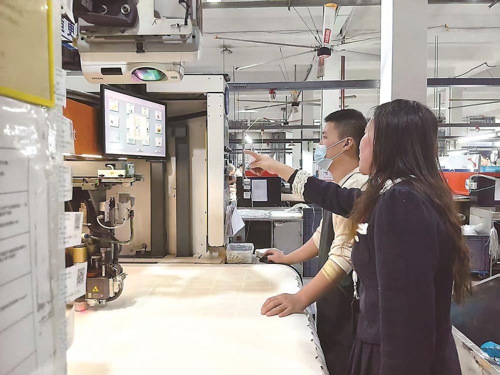 在力奴鞋业,制鞋工正在学习操作智能切割机。