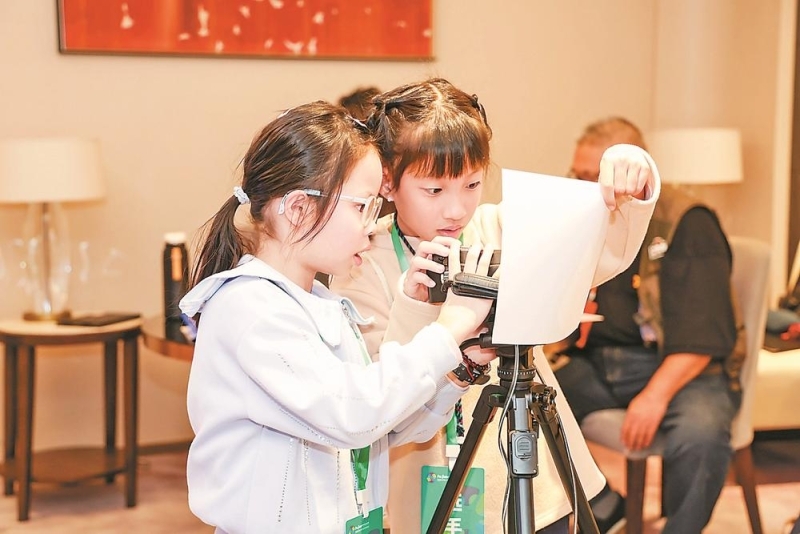 参与活动的小学生在学习摄像机使用技巧。方晨颖 摄