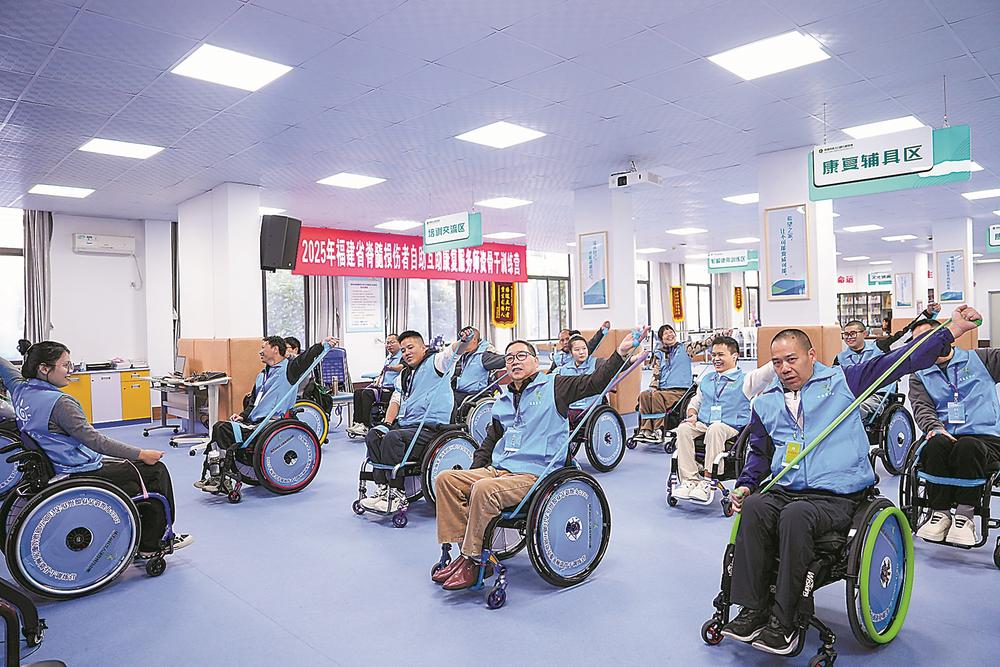 2025年福建省脊髓损伤者自助互助康复服务师资骨干训练营上,伤友在训练康复动作。