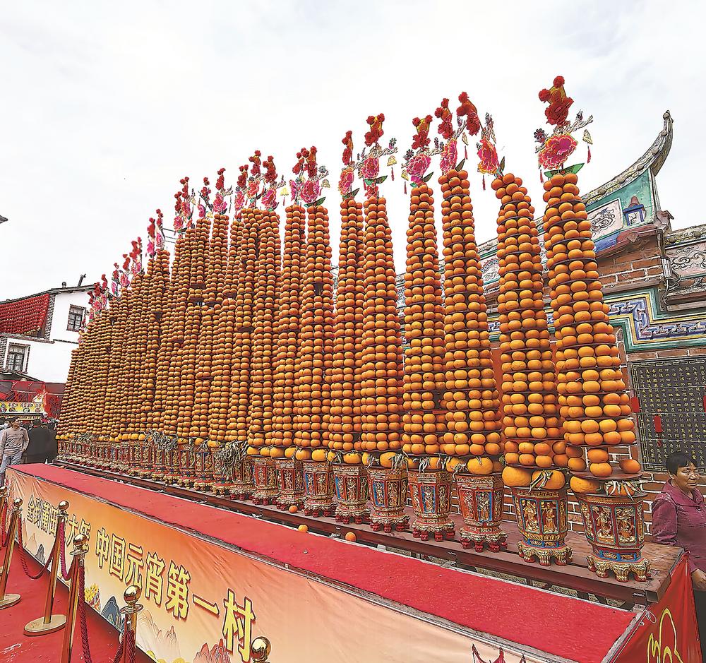 莆田市黄石镇江东村元宵节垒红桔塔,这一祀典祭品于2022年被列入福建省非物质文化遗产代表性项目名录。记者 刘志雄 摄