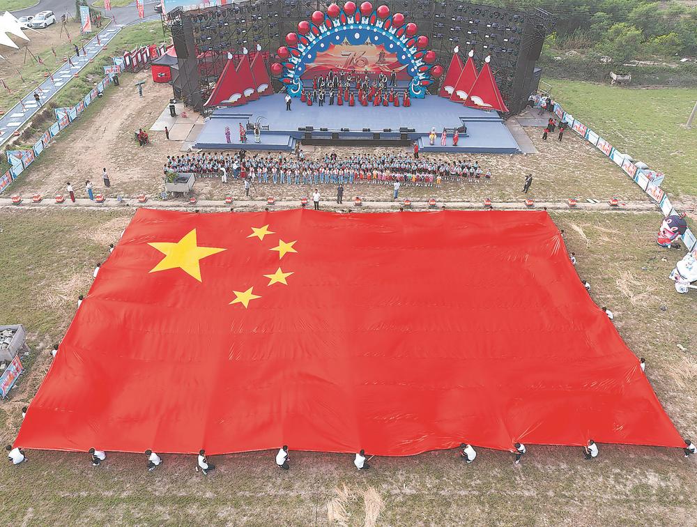 10月1日,南安市石井镇干部群众和学校师生举行歌唱祖国快闪活动。学生们在草坪上展开巨幅国旗,在《歌唱祖国》的歌声中祝福祖国。(记者 王毅 摄)